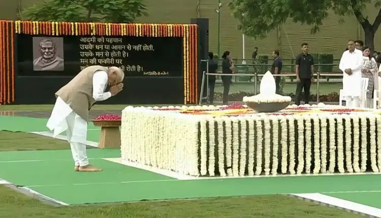 ଣନ୍ୟୁଜ ଡେକ୍ସ : ଆଜି ପୂର୍ବତନ ପ୍ରଧାନମନ୍ତ୍ରୀ ଭାରତରତ୍ନ ଅଟଳ ବିହାରୀ ବାଜପେୟୀଙ୍କ ୯୪ତମ ଜନ୍ମବାର୍ଷିକୀ ପାଳିତ ହେଉଛି। ଏହି ଅବସରରେ ପ୍ରଧାନମନ୍ତ୍ରୀ ନରେନ୍ଦ୍ର ମୋଦୀ ଦିଲ୍ଲୀର ବିଜୟ ଘାଟରେ ଅବସ୍ଥିତ ଅଟଳଜୀଙ୍କ ସମାଧି ‘ସଦୈବ ଅଟଳ’କୁ ଯାଇ ପୁଷ୍ପମାଲ୍ୟ ଅର୍ପଣ କରି ଶ୍ରଦ୍ଧାଞ୍ଜଳି ଜଣାଇଛନ୍ତି।