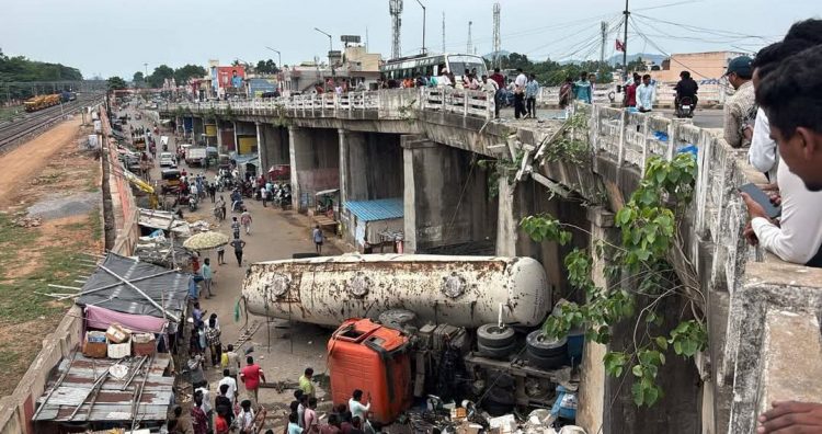 ନ୍ୟୁଜ ଡେକ୍ସ: ବଡ଼ ଅଘଟଣ। ଓଭର ବ୍ରିଜ ଉପରୁ ତଳକୁ ଖସିଲା ଟ୍ୟାଙ୍କର। ଓଭର ବ୍ରିଜ ଉପରୁ ୩୦ ଫୁଟ୍ ତଳକୁ ଖସିଲା ଟ୍ୟାଙ୍କର। ଓଭର ବ୍ରିଜ ଉପରେ ଯାଉଥିବା ଏକ ଟ୍ୟାଙ୍କର ଭାରସାମ୍ୟ ହରାଇ ଓଭର ବ୍ରିଜ ଉପରୁ ୩୦ ଫୁଟ୍ ତଳକୁ ଖସି ପଡିଥିବା ସୂଚନା। ଦୁର୍ଘଟଣା ଘଟିଛି ରାୟଗଡ଼ା ସଦର ମାର୍କେଟ୍ ଓଭର ବ୍ରିଜ ଉପରେ।