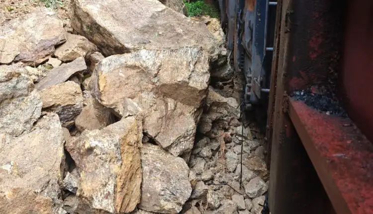 ନ୍ୟୁଜ ଡେକ୍ସ : ଆନ୍ଧ୍ର ପ୍ରଦେଶର ଚିମିଡିପାଲି ଏବଂ ତାୟଡା ରେଳ ଷ୍ଟେସନ ମଧ୍ୟରେ ଶନିବାର ବିଳମ୍ବିତ ରାତିରେ ଏକ ବିରାଟ ପଥର ଖଣ୍ଡ ରେଳ ଧାରଣା ଉପରେ ଖସିପଡିଥିବା ଫଳରେ ଏକ ମାଲବାହୀ ଟ୍ରେନ୍ ଲାଇନଚ୍ୟୁତ ହୋଇଛି। ଏହି ଘଟଣା ଆନ୍ଧ୍ର, ଓଡିଶା ଏବଂ ଛତିଶଗଡ଼କୁ ସଂଯୋଗ କରୁଥିବା କେକେ ରେଳ ଲାଇନରେ ଘଟିଥିବାରୁ ଉକ୍ତ ରୁଟରେ ରେଳ ଯାତାୟାତ ପ୍ରଭାବିତ ହୋଇଛି।