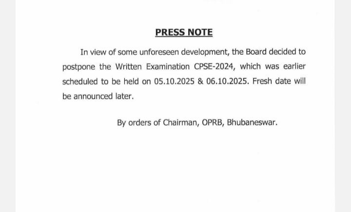 ନ୍ୟୁଜ ଡେକ୍ସ: ଓଡ଼ିଶା ପୁଲିସ୍ ନିଯୁକ୍ତି ବୋର୍ଡ (ଓପିଆରବି) ପକ୍ଷରୁ ଆଗାମୀ ୫ ଓ ୬ ତାରିଖରେ ହେବାକୁ ଥିବା ସବ-ଇନ୍ସପେକ୍ଟର (ଏସଆଇ) ଲିଖିତ ପରୀକ୍ଷାକୁ ଅନିବାର୍ଯ୍ୟ କାରଣରେ ସ୍ଥଗିତ କରାଯାଇଛି। ନୂଆ ତାରିଖ ଶୀଘ୍ର ପ୍ରକାଶିତ ହେବ।