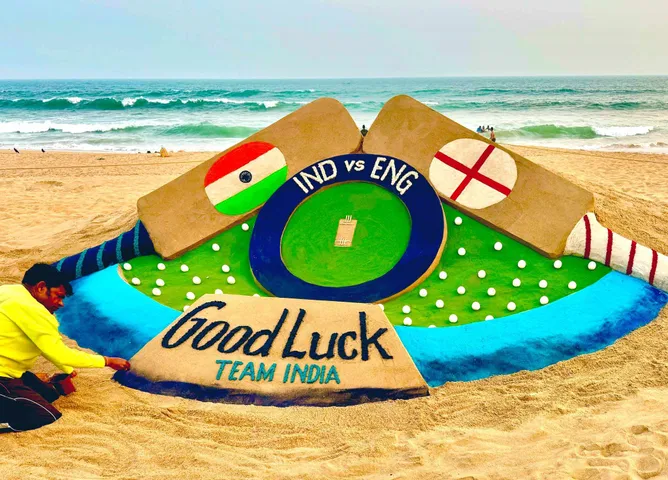 ସମସ୍ତେ ଟିମ୍ ଇଣ୍ଡିଆର ବିଜୟ ନେଇ ଆଶାବାଦୀ ଥିବା ବେଳେ ବାଲୁକା କଳା ମାଧ୍ୟମରେ ଶୁଭେଚ୍ଛା ଜଣାଇଛନ୍ତି ପଦ୍ମଶ୍ରୀ ସୁଦର୍ଶନ ପଟ୍ଟନାୟକ । ପୁରୀ ବେଳାଭୂମିରେ ବାଲିରେ କଳାକୃତି କରି ଭାରତୀୟ ଖେଳାଳିଙ୍କୁ ଶୁଭେଚ୍ଛା ଜ୍ଞାପନ କରିଛନ୍ତି ।ଏପଟେ ସକାଳୁ ସକାଳୁ କ୍ରିକେଟ ପ୍ରେମୀ ଇଣ୍ଡିଆ ଟିମ୍ ଜର୍ସି ପିନ୍ଧି ମୁହଁରେ ତ୍ରିରଙ୍ଗା ଆଙ୍କି ହାତରେ ଜାତୀୟ ପତାକା ଧରି ଷ୍ଟାଡିୟମ ଭିତରକୁ ପ୍ରବେଶ କରିବା ପାଇଁ ଉତ୍ସାହିତ ଅଛନ୍ତି । ୪୫ ହଜାର ଦର୍ଶକଙ୍କ ପାଇଁ ଷ୍ଟାଡିୟମ ଭିତରେ ବ୍ୟବସ୍ଥା ହୋଇଛି। ଏହି ଅବସରରେ ବାଲୁକା ଶିଳ୍ପୀ ପଦ୍ମଶ୍ରୀ ସୁଦର୍ଶନ ପଟ୍ଟନାୟକ ପୁରୀ ବେଳାଭୂମିରେ ଏକ ସୁନ୍ଦର ବାଲୁକା କଳା ମାଧ୍ୟମରେ ଭାରତୀୟ ଟିମକୁ ଶୁଭେଚ୍ଛା ଜଣାଇଛନ୍ତି।
